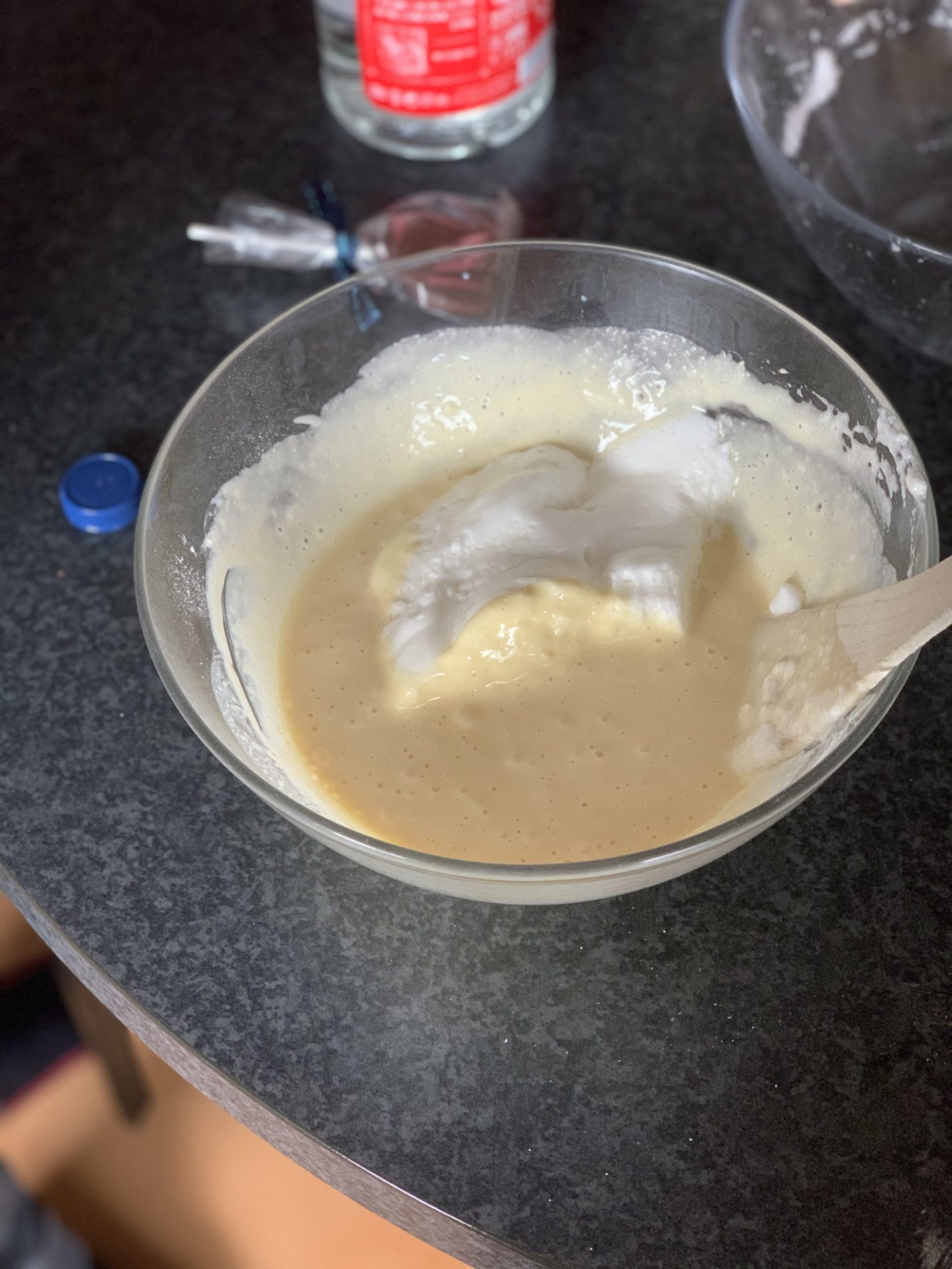 4. Incorporez délicatement les blancs montés, au premier mélange pour ne pas les casser.