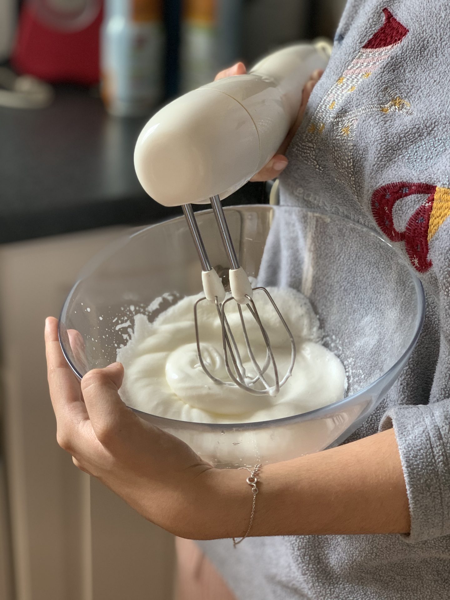 3. Avec les blancs récupérés des jaunes, montez les en neige. (C’EST LÀ L’ASTUCE POUR DES PANCAKES FLUFFY. Grâce à ça, ils vont être aérés et donc fluffy à la cuisson!)